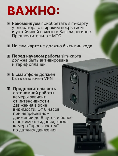 ✅Данная камера работает с сим картой 4G и является миниатюрная беспроводной камерой видеонаблюдения.Камера позволяет просматривать изображение дистанционно со смартфона через бесплатное приложение О-КАМ. Встроенный датчик движения позволяет оповещать пользователя сообщением на смартфон и e-mail при обнаружении активности перед камерой. Для работы необходимо установить в камеру обычную сим-карту сотового оператора с поддержкой 4G/LTE. Камера оснащена встроенными микрофоном и динамиком, что позволит вести видеозапись со звуком, а также поговорить с человеком, находящимся рядом с камерой, через приложение на смартфоне. Матрица камеры обеспечивает качественное изображение уровня Full HD с разрешением 1920х1080 пикселей. Встроенный видеорегистратор позволяет сохранять видеозаписи на карту памяти MicroSD до 64 Гб, при этом весь архив записей можно скачать и просмотреть дистанционно. Так же камера оснащена встроенным аккумулятором 2900 mAh, это позволит ей работать без подзарядки до 8 часов в режиме записи и до 8 дней по датчику движения.